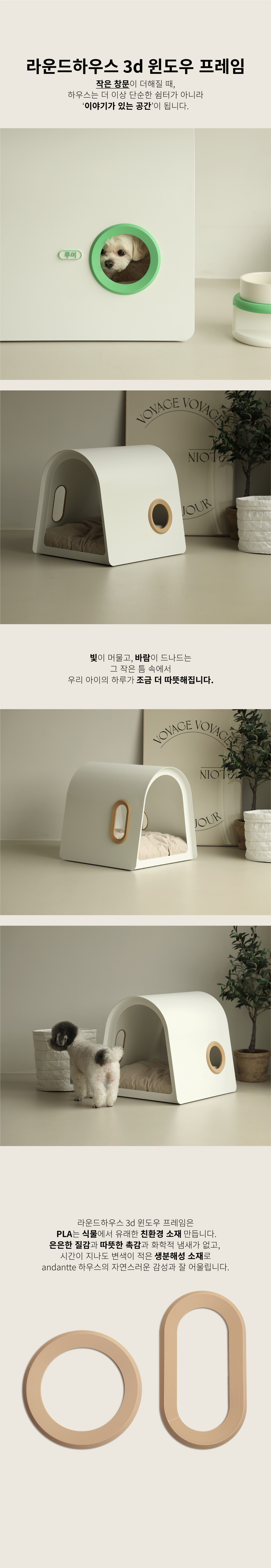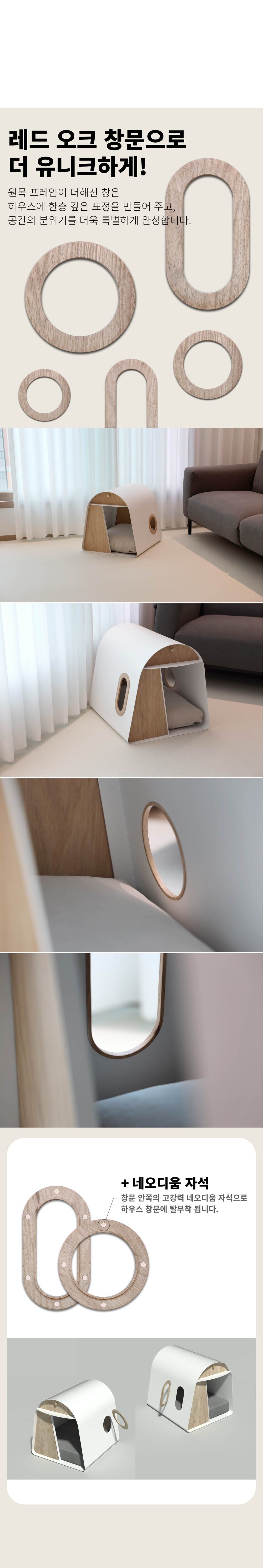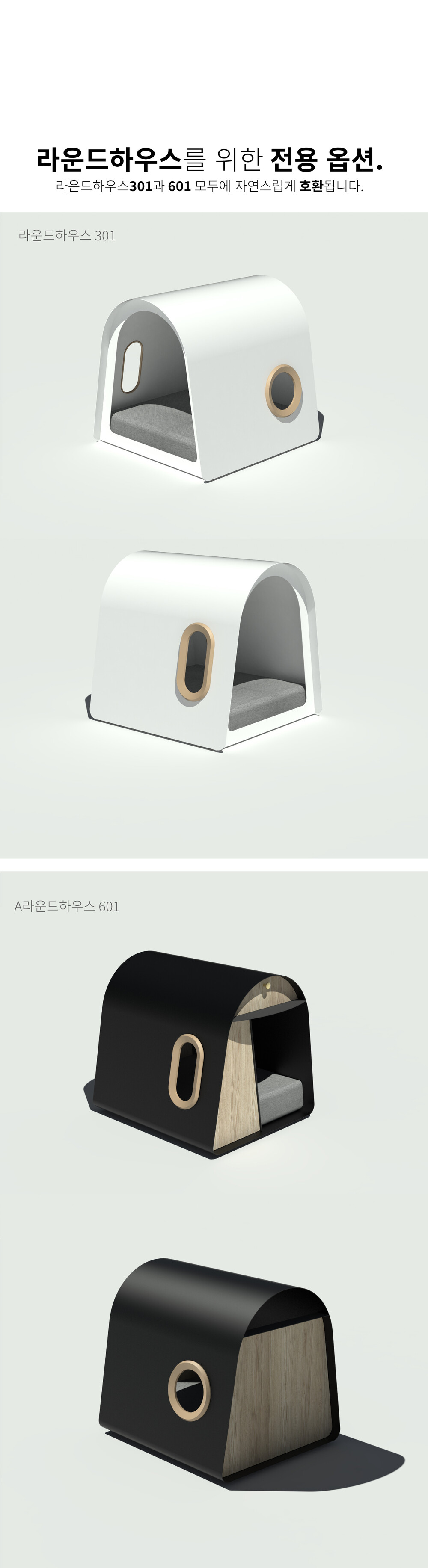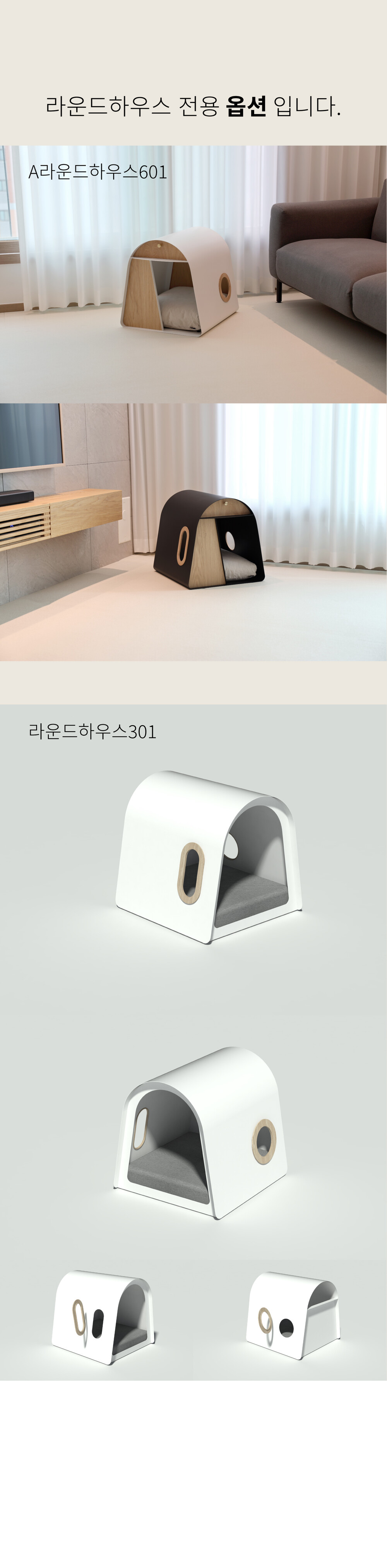 라운드하우스301은 부드럽고 유려한 곡선의 심미성을 극대화한 하우스 입니다. 미려한 외관뿐만 아니라 효율적인 공간으로 반려동물에게 편안한고 안정감있는 공간을 제공합니다.